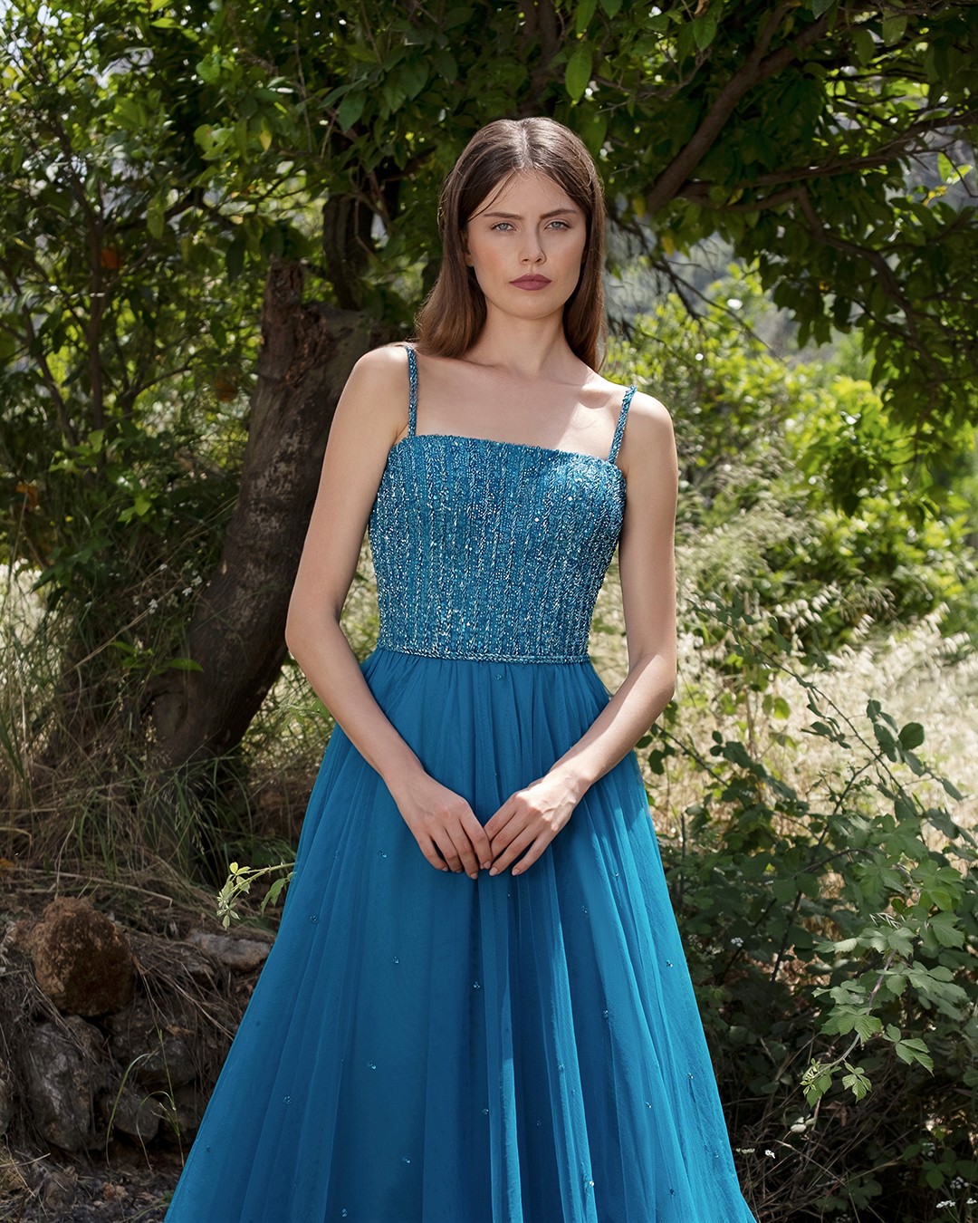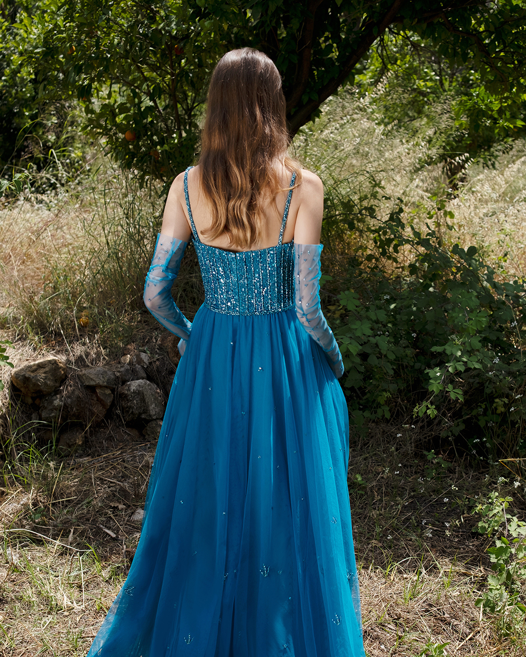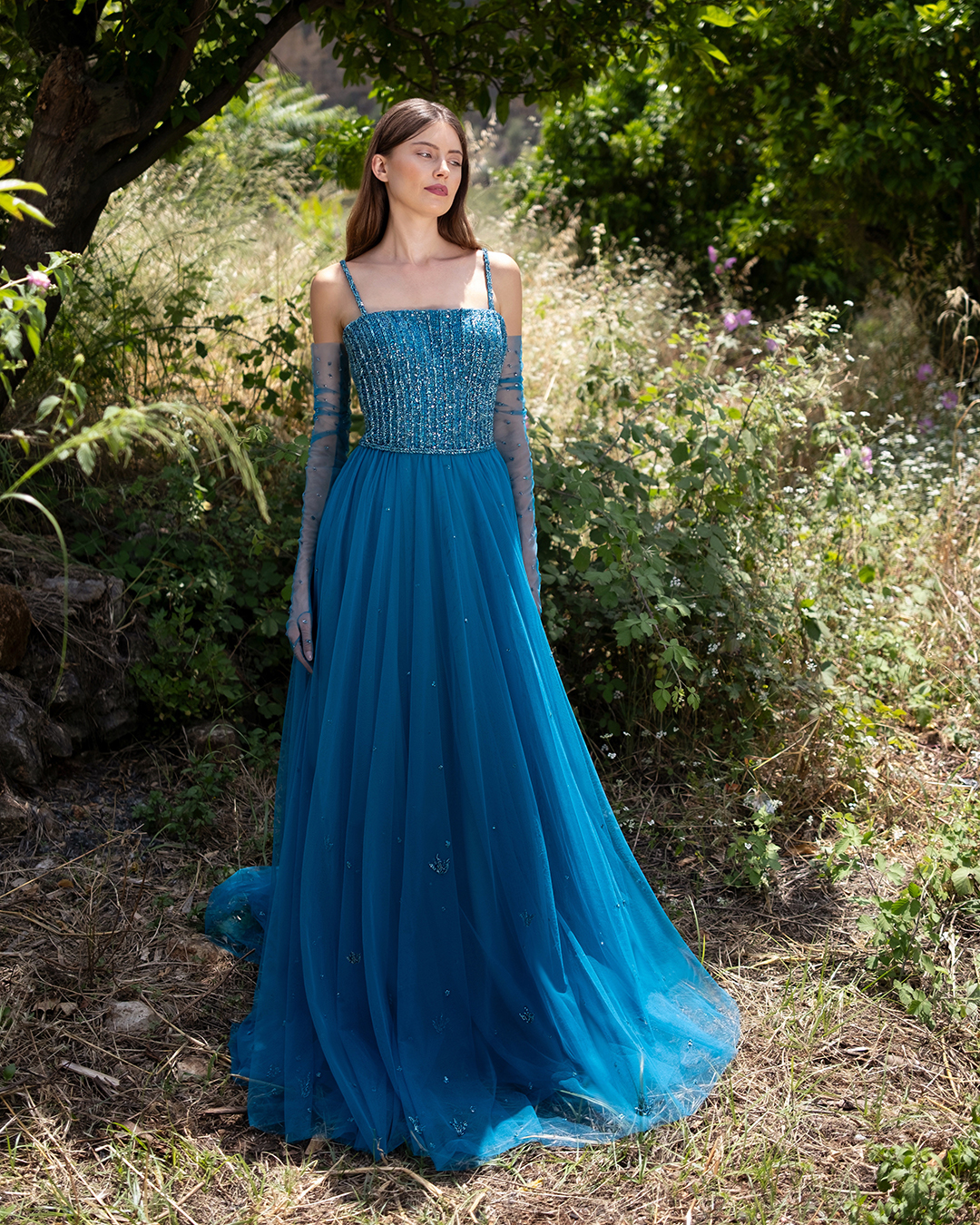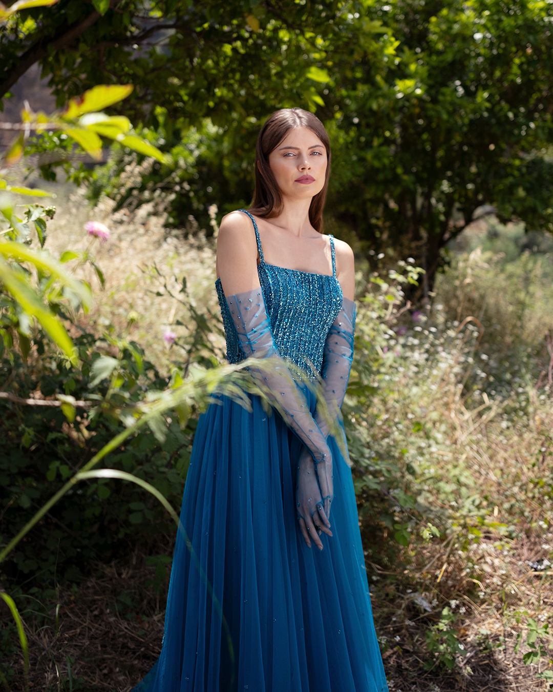 Flowing tulle gown with delicate thin straps, a hand-beaded bodice adorned with sequins and beads, an embroidered sequin belt, scattered beading on the skirt, and matching wrinkled tulle gloves.