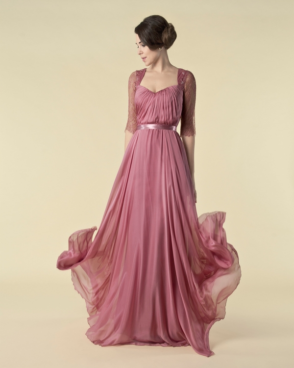 Long silk mousseline gown with drapes and chantilly lace cuts. Open back.
