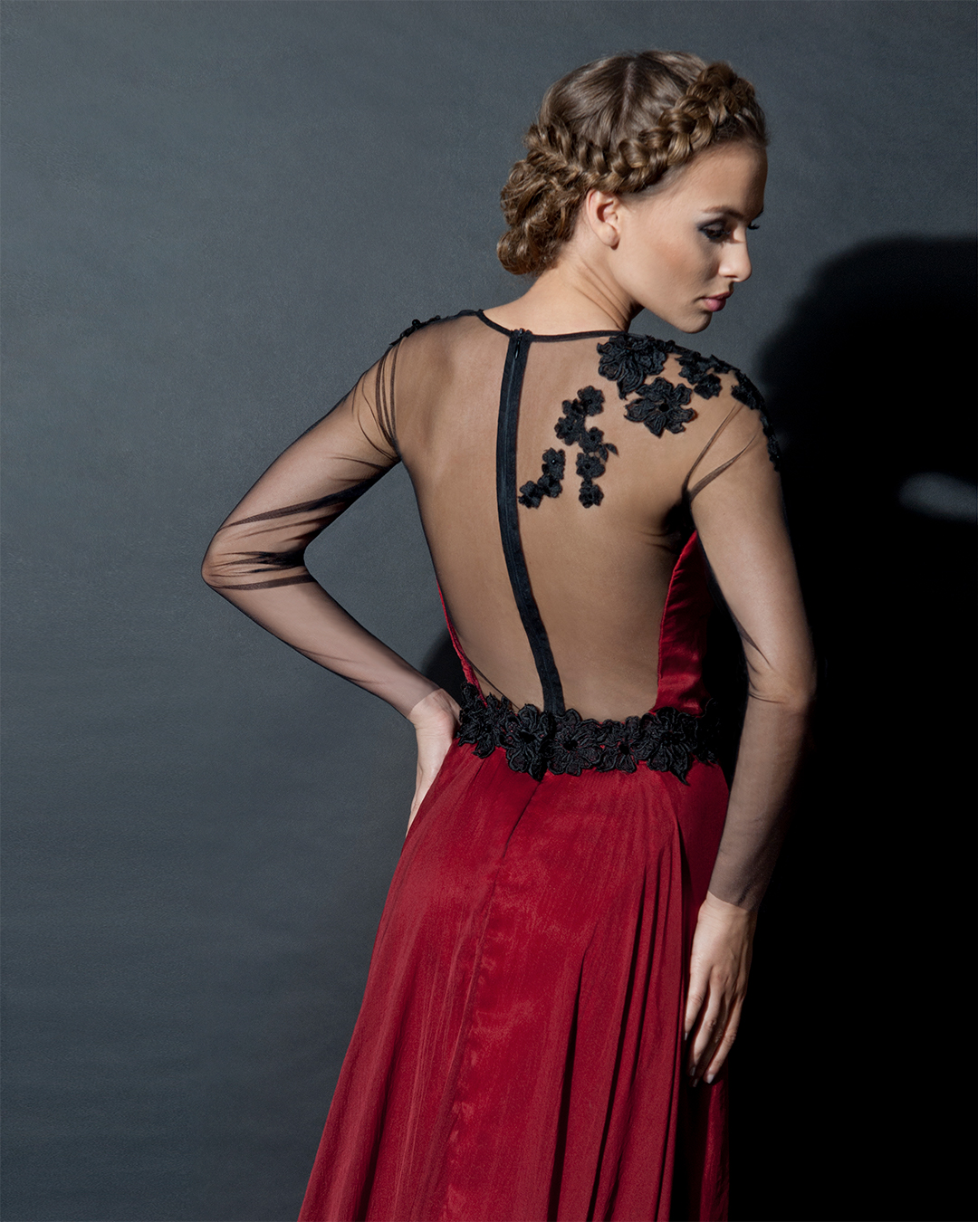 Long silk mousseline and tulle gown . Flowers embroideries with Swarovski stones encrusted on belt and collar.