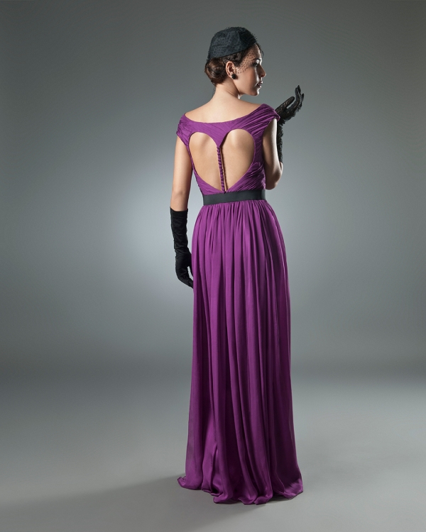 Long silk mousseline gown with drapes and heart shape design with buttons on the back.