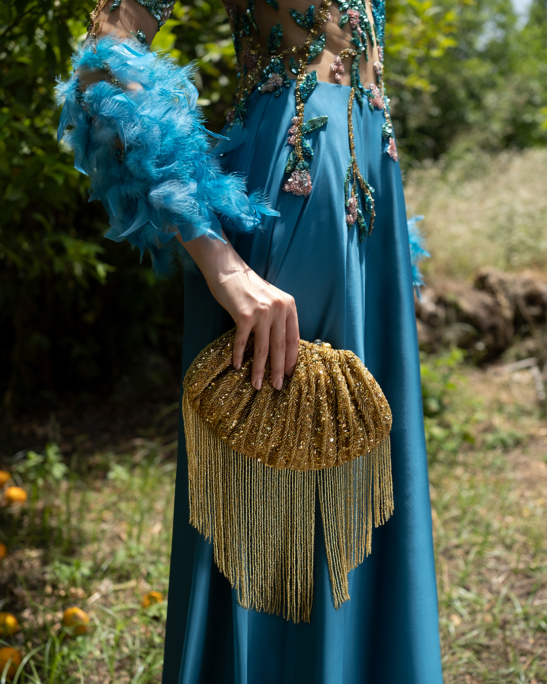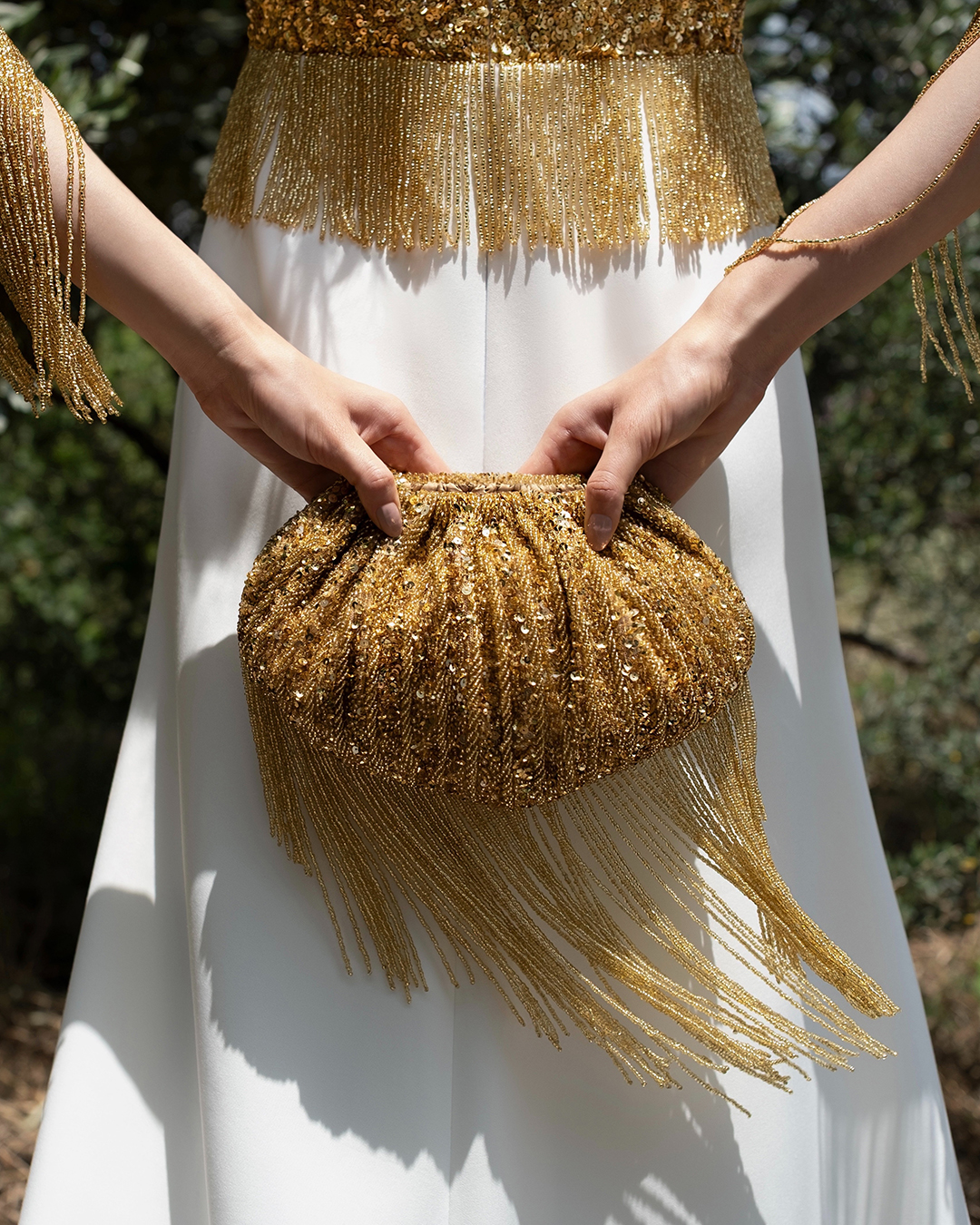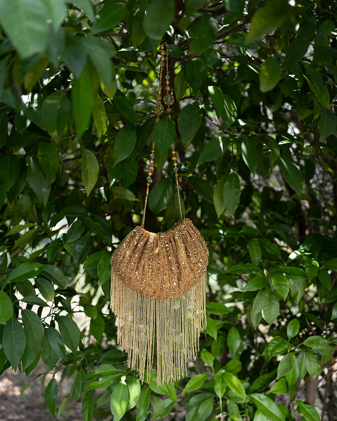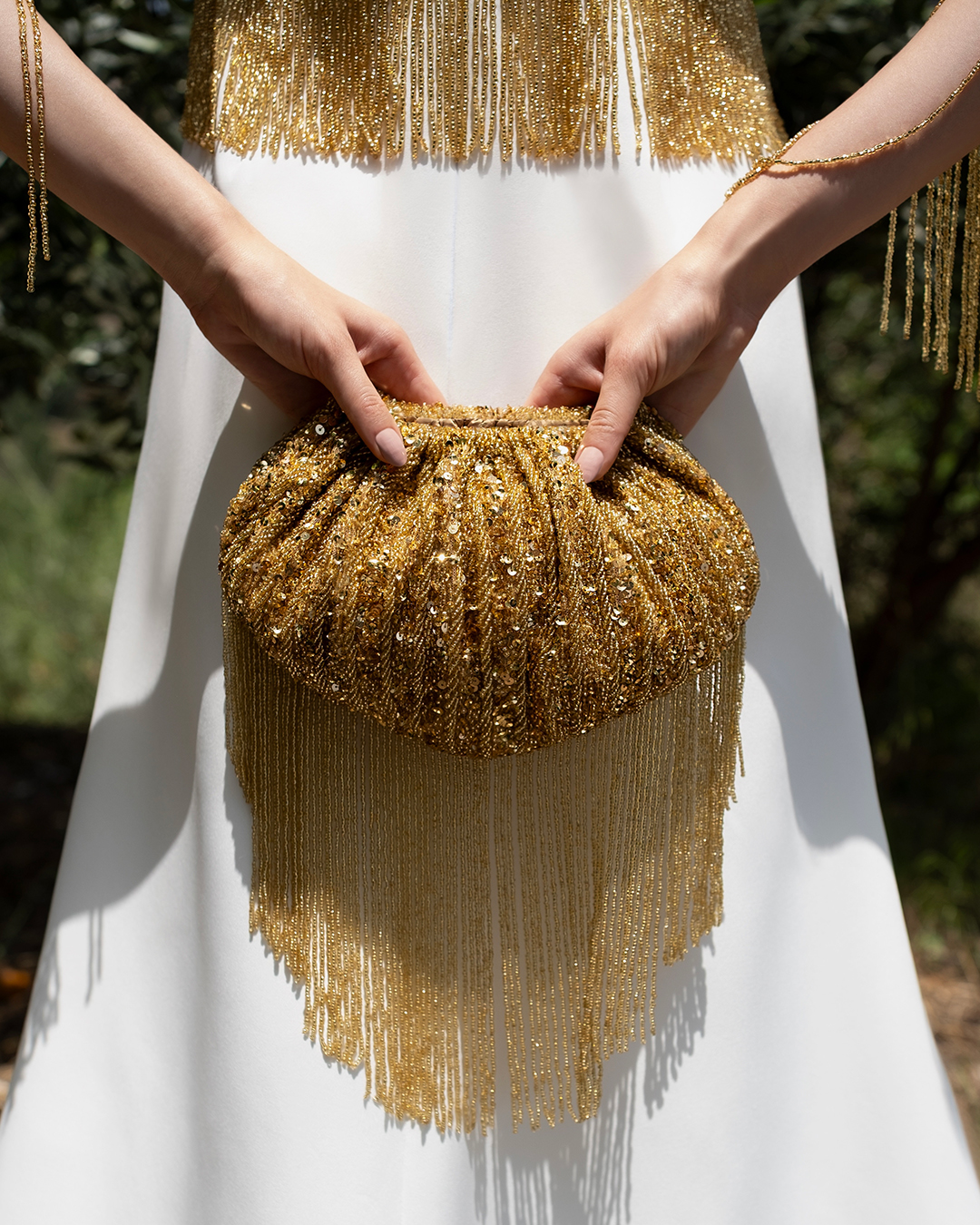 A meticulously handcrafted, pouch-shaped statement clutch featuring intricate sequin and beadwork, finished with cascading beaded fringes and an optional embellished handle.
